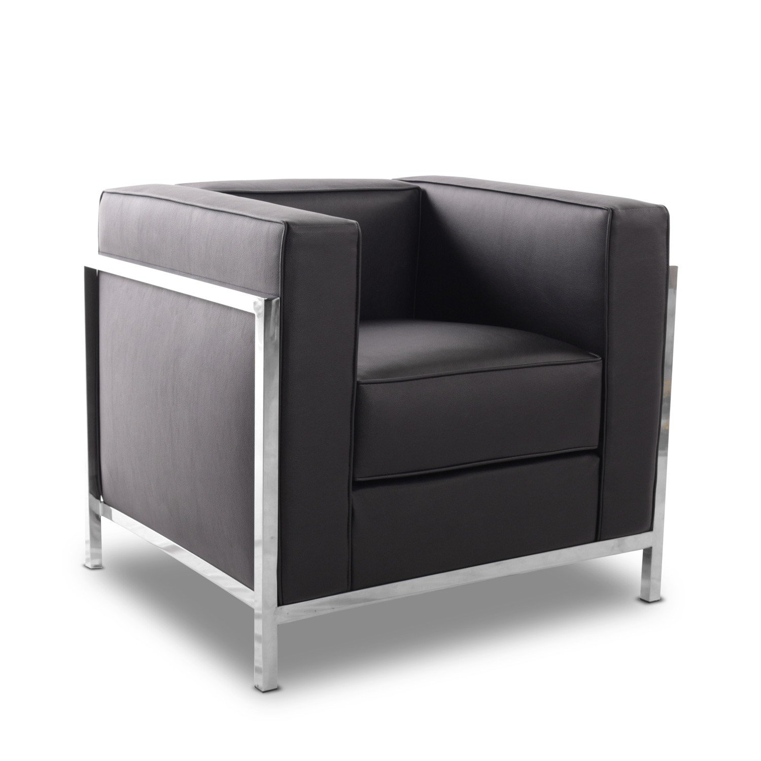 Además, según su descripción, sobresale por: Sillón de diseño, acero inoxidable, tapizado similpiel negra.