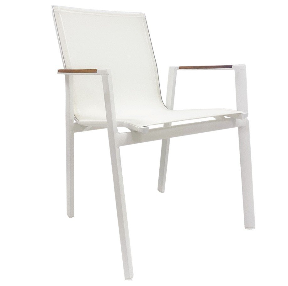 FICHA TÉCNICA: -Sillón de diseño, apilable, multiusos. -Fabricado con armazón de aluminio lacado en color blanco -Asiento y respaldo en textilene de color blanco -Reposabrazos de madera de teka -Uso en exterior e interior. -Sobre pedido podemos suministrar en otros colores. DIMENSIONES: Ancho: 47 cms Fondo: 52 cms Altura total: 84 cms EMBALAJE: Plástico y cartón. UNIDADES: 4 VOLUMEN: 0,34 m3