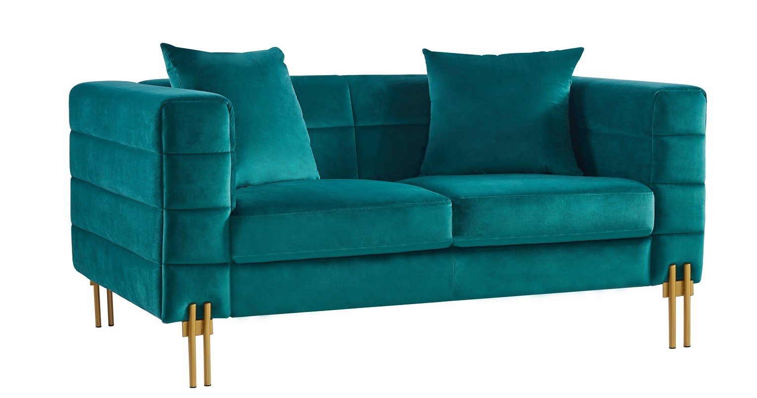 FICHA TÉCNICA: -Sofá de diseño, 2 plazas, multiusos. -Interior con armazón de madera y espuma de gran densidad -Patas metálicas con acabado dorado. -Tapizado en tejido velvet de color verde oscuro 42 -Cojines decorativos incluidos -Sofá de 3 plazas a juego – opcional. -Otros colores disponibles -Sobre pedido podemos suministrar en otros colores. DIMENSIONES: Ancho: 157 cms Fondo: 84 cms Altura: 71 cms EMBALAJE: Plástico y cartón. UNIDADES: 1 VOLUMEN: 0,82 m3 IMPORTANTE.- Este producto dispone de certificado ( test report ), emitido por laboratorio internacional homologado, en el que se detalla el cumplimiento de la norma UNE o su equivalente internacional.