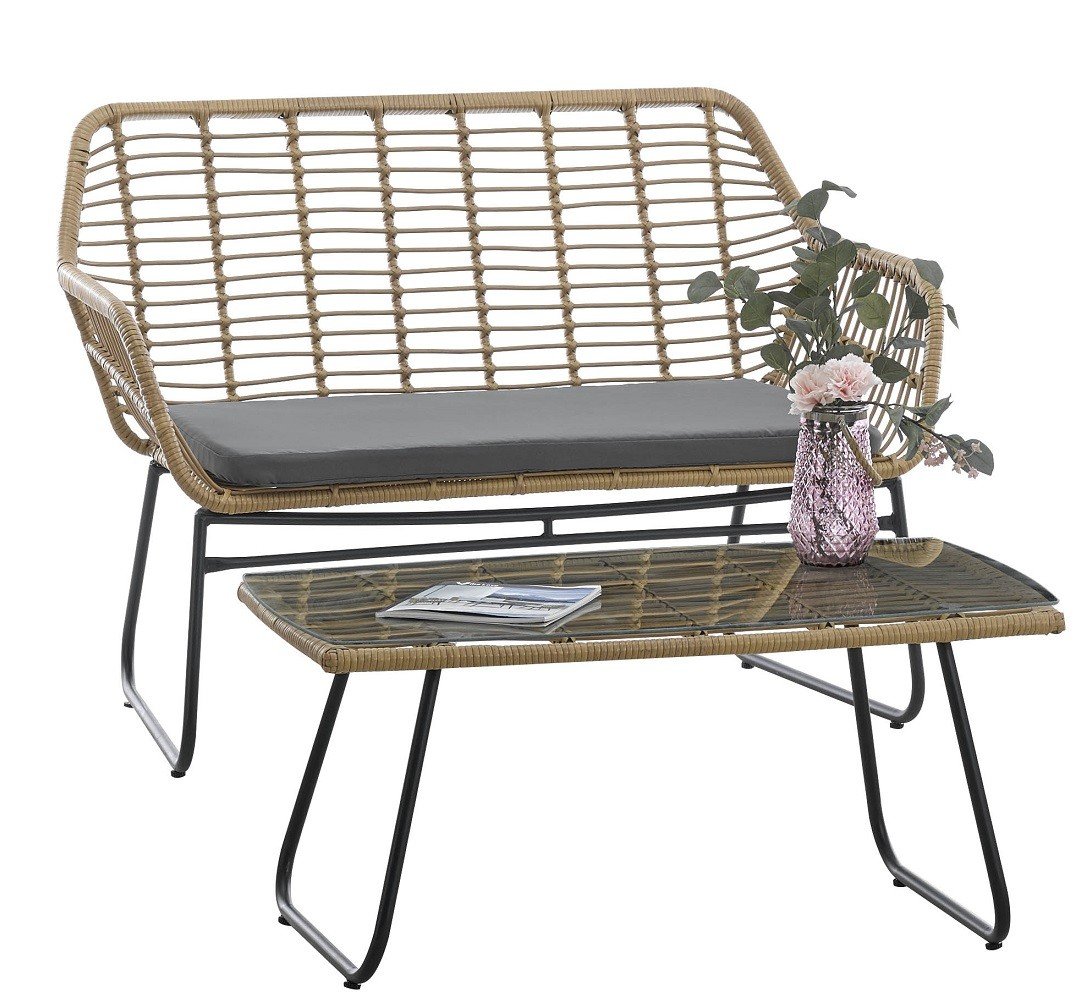 Además, según su descripción, sobresale por: Sofá de diseño, base de metal con acabado pintura epoxi de color negro mate, asiento y respaldo de ratán sintético de color beige. Cojín en el asiento de color negro. Uso en interior y exteriores protegidos. Sillón y mesa baja rectangular a juego opcional..